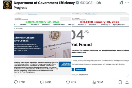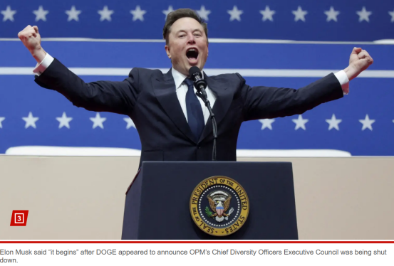 在特朗普总统就职典礼数小时后,马斯克20日在社交平台X发布帖文称,“政府效率部”在成立后立即开始运作,首个举措是裁撤一个名为首席多元化官员执行委员会(CDOEC)的机构。“一切已经开始,”马斯克写道。“政府效率部”的官方账号也发帖称这是一个“进展”,帖文附上的一张截图,显示CDOEC的网站页面已经无法打开。